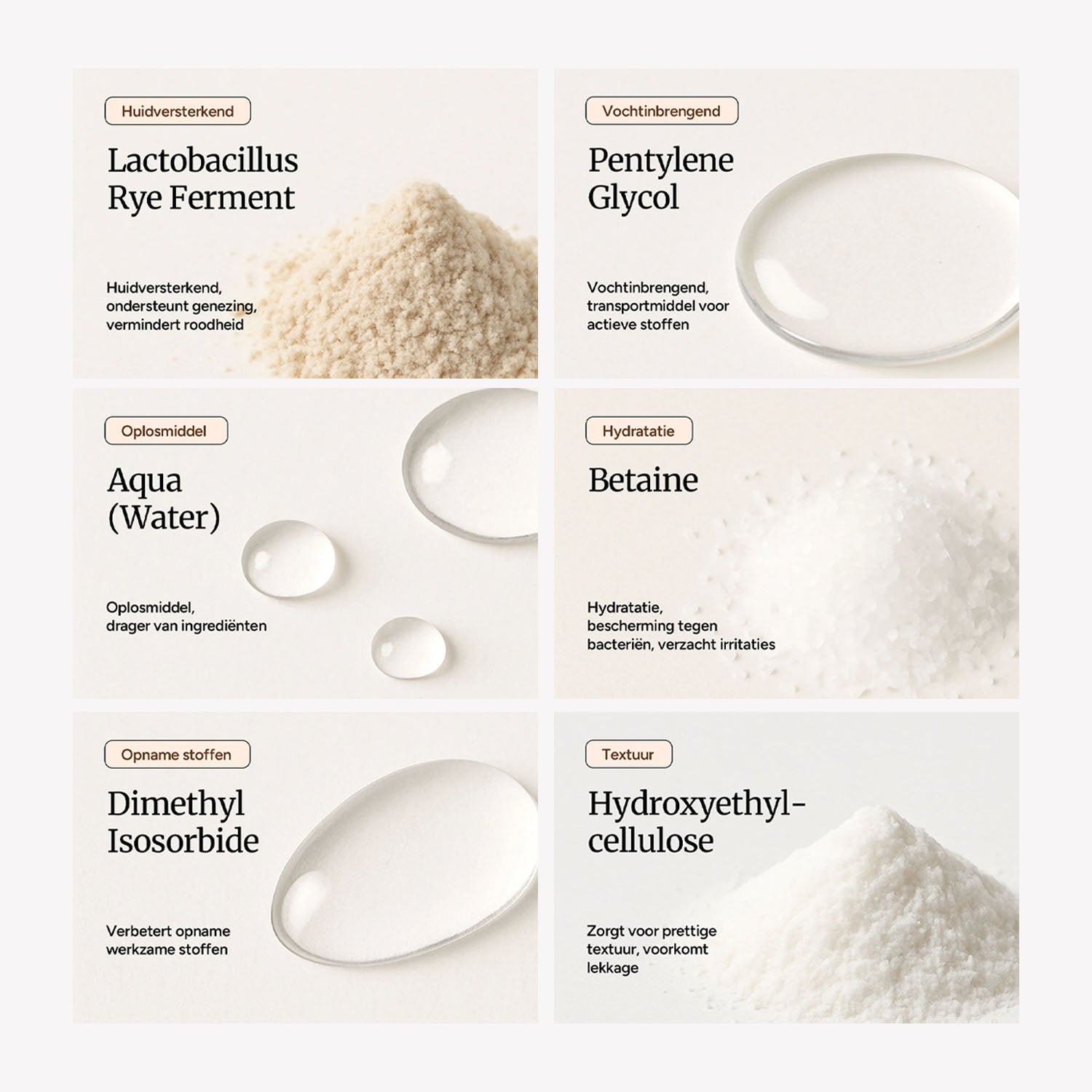 Pentylene Glycol, Betaine, Lactobacillus/Rye Flour ferment, Dimethyl Isosorbide, Polysorbate 80, Hydroxyethylcellulose, Phosphatidylcholine, Tocopherol.